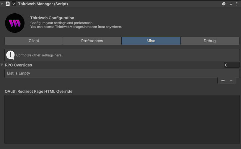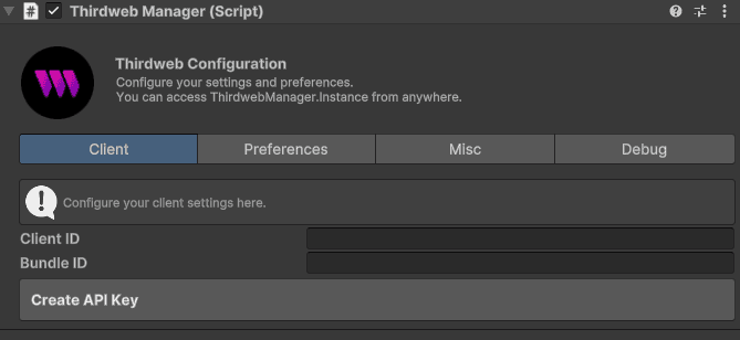 • Client ID: Required thirdweb API Key. Without it, ThirdwebManager refuses to initialize and logs an error.